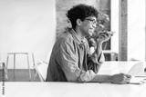 Smart successful young businessman freelancer it marketing worker designer programist student recording voice message talking on mobile cell smart phone with customers partners colleague at workplace