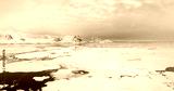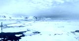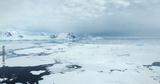 Aerial panorama winter arctic ocean landscape. Snow covered frozen sea bay coastline. Antarctica wild nature landscape. Ice floe cold polar water, mountains in background. Antarctic travel exploration