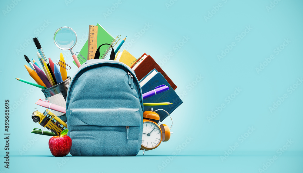 Blue backpack with alarm clock and school equipment. Back to school concept on blue background with copy space. 3D Rendering, 3D Illustration