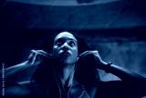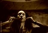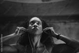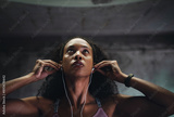 Fitness, music and face of woman at wall for commitment, determination or motivation for sport. Female athlete, earphones or serious in gym for workout, thinking or drive from favorite song on radio