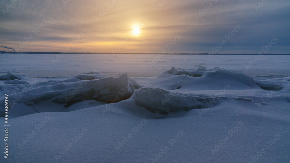 The tranquil landscape showcases a vast, untouched wilderness with icy formations