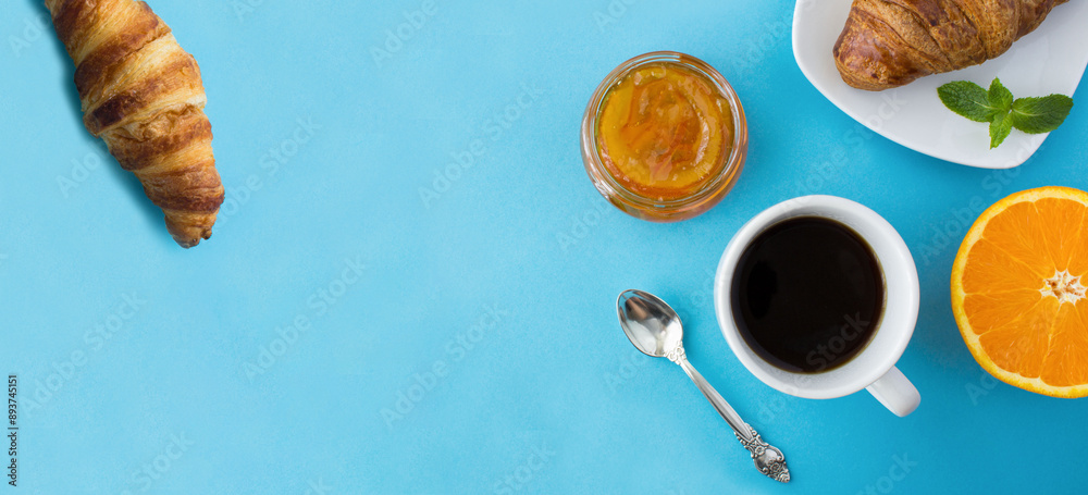 Continental breakfast. Coffee cup, orange marmalade and croissant on the blue background. Top view.Copy space.