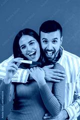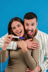 Vertical. A happy Caucasian couple showing a positive pregnancy test to the camera, celebrating that they are going to be parents against a blue background. Parenthood, motherhood and fatherhood.