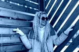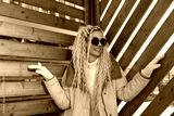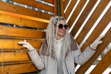 Woman With Long Blonde Hair and Sunglasses in Front of Wooden Wall