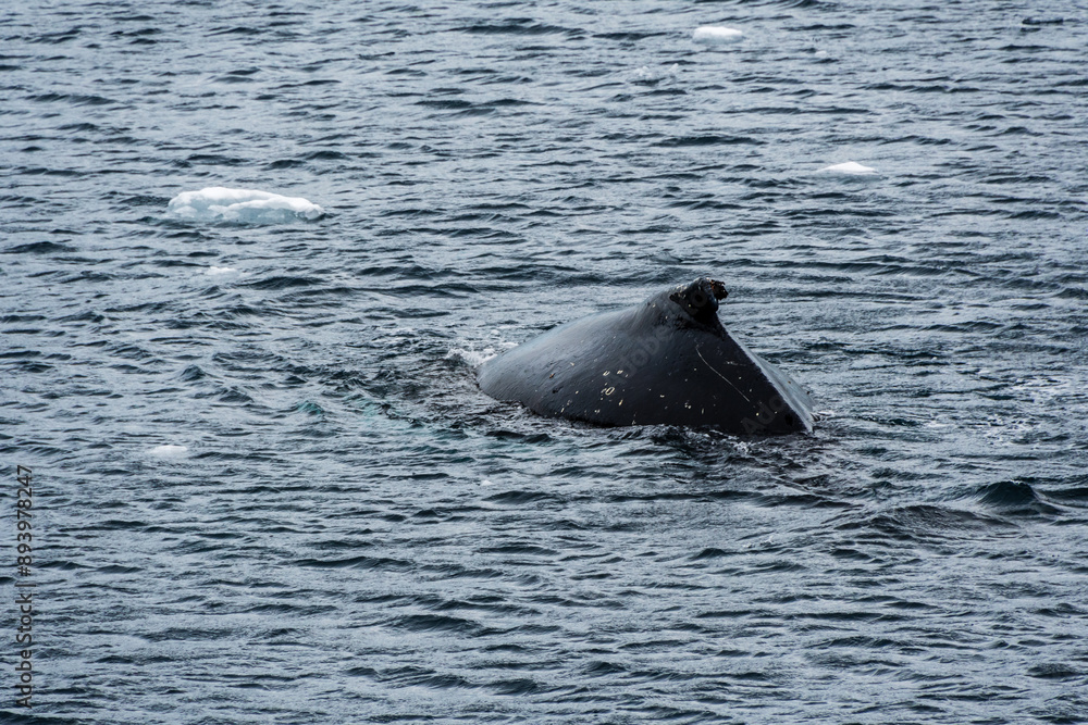 Close-up of the back of a diving humpback whale -Megaptera novaeangliae- including the dorsal fin and blow hole. Image taken inear the entrance of the Lemaire channel, in the Antarctic peninsula.