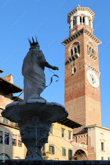 Statue of Madonna fountain on Piazza delle Erbe and the Lamberti Tower (Torre dei Lamberti) in the old town of Verona, Italy