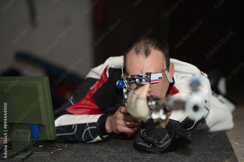 A dedicated male athlete practices for an upcoming competition during a sports shooting training session, known for his focus, precision, and commitment to excellence in his shooting skills.