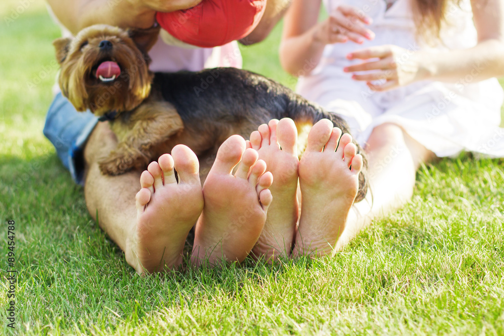 Couple feets lying in line at green grass and dog