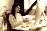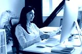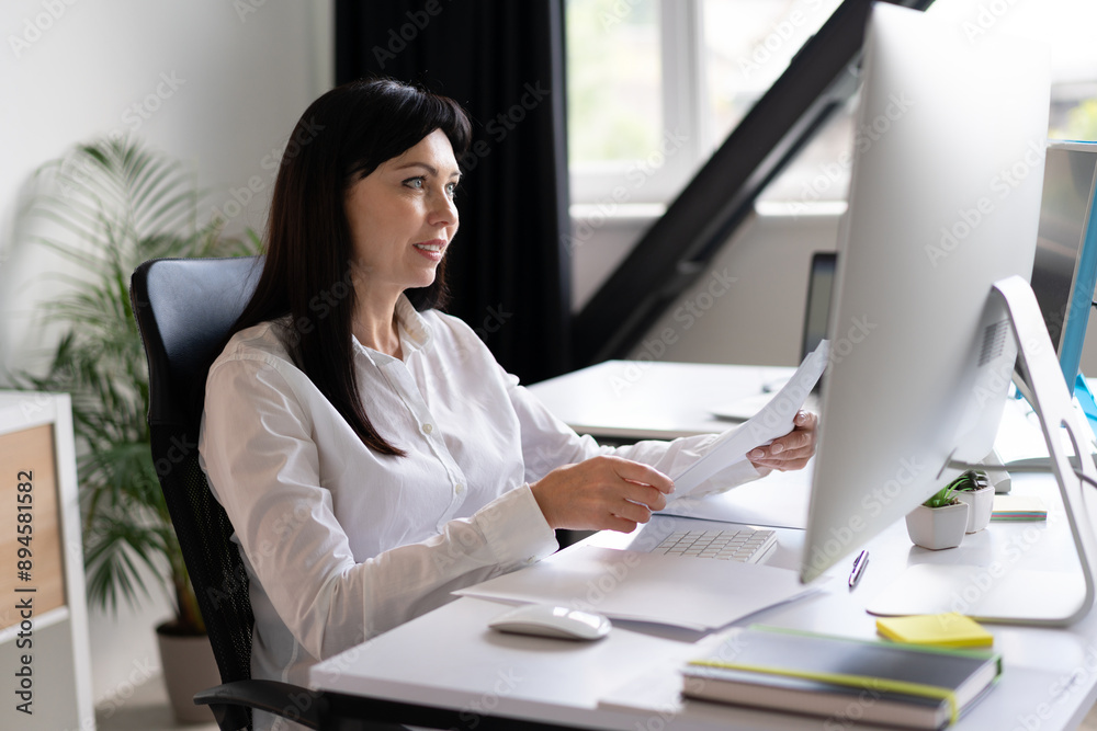 Professional Woman Working At Desk In Modern Office, Focused On Computer And Documents, Business Environment, Productivity Concept