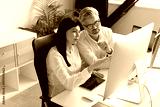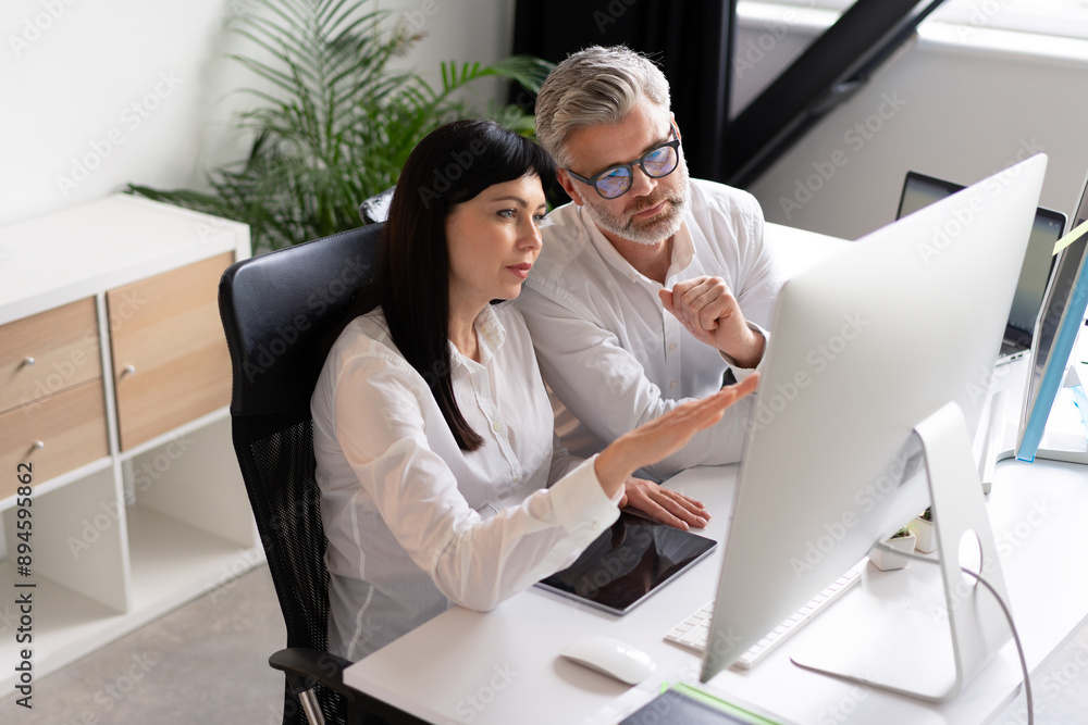 Focused Colleagues Discussing Project On Computer In Modern Office