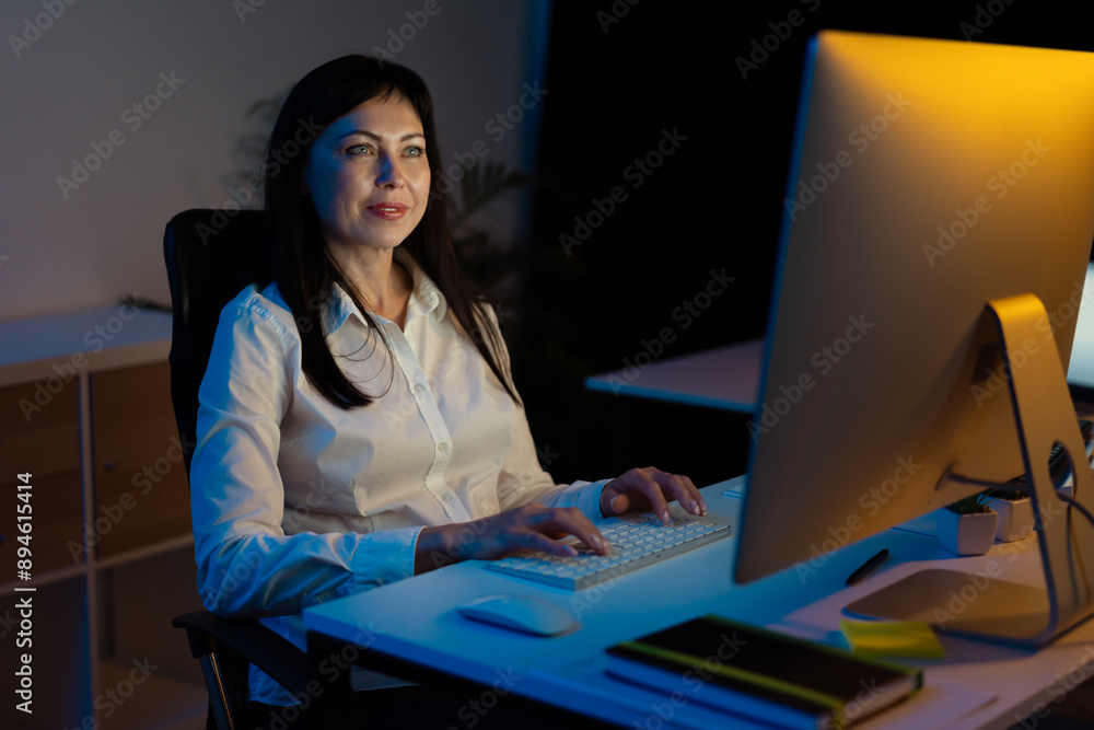 Businesswoman Working On Computer In Office During Evening, Focused And Productive. Contemplative Mood With Modern Technology.