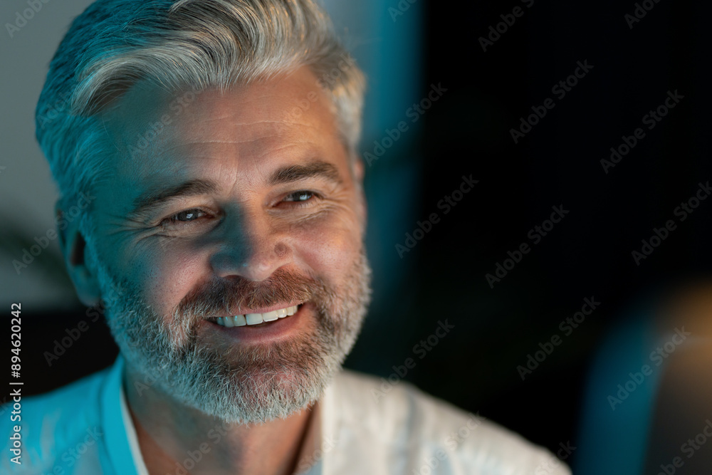 Close-Up Of Smiling Mature Man With Gray Hair And Beard, Exuding Warmth And Happiness. Concept Of Positivity, Confidence, And Life Experience.