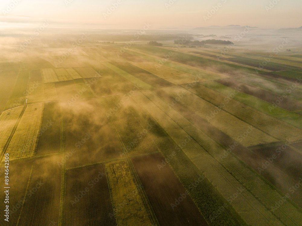 Foggy Sunrise Over Scenic Countryside and Vibrant Farmland