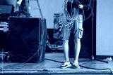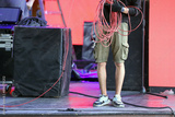 Worker gathering cables on stage. Electrician working on a stage. Man working at event. Technician preparing the lighting wiring for a musical show on stage.
