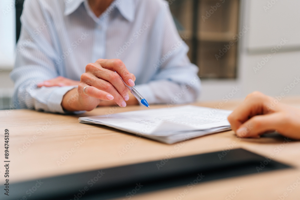 Close-up cropped shot of unrecognizable female doctor explaining young woman patient reported medical results or news about rehabilitation, counseling, during medical examination in clinic.