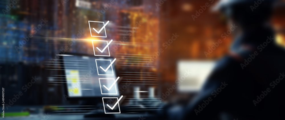 Manufacturing industrial checklist concept, inspector staff using computer to check inventory, transportation or cybersecurity, cyber background and bluring with checkmark graphic on foreground.