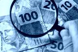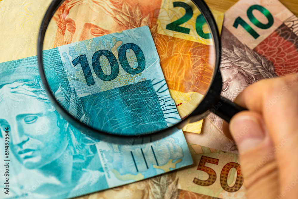 Brazilian reals viewed under a magnifying glass, Concept, economics and finance, Money of Brazil