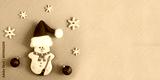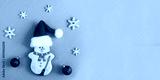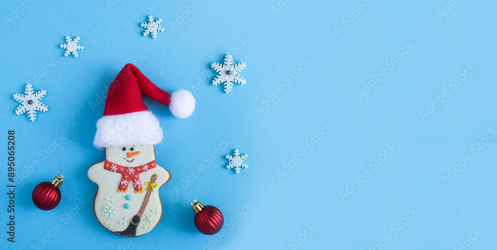 Christmas gingerbread in the shape of a snowman with Santa Claus hat on the blue background. Copy space.