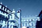 Statue of Madonna fountain, Torre del Gardello - XII century (Gardello Tower) and the facade of Palazzo Maffei, a historical palace on Piazza delle Erbe in Verona, Italy