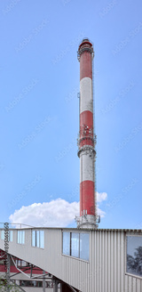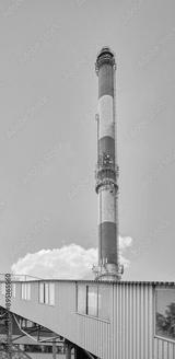 The chimney of a coal-fired power plant against the sky.
