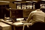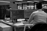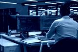 Technician using computer to troubleshoot hardware and software issues in server hub. IT expert implementing and maintaining server and network infrastructure in data center using PC