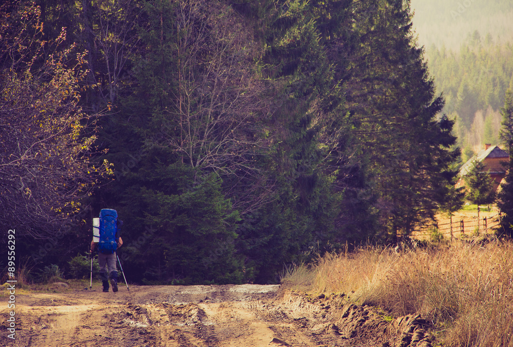 Lone traveler with a backpack walking along the road through the forest in the mountains.