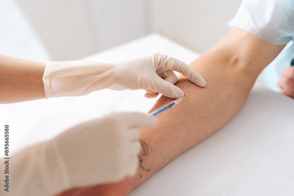 Closeup of preparation for blood test with male patient by female doctor in gloves on table in white bright room. Nurse pierces man patient arm vein with needle tube. Concept of medical treatment
