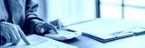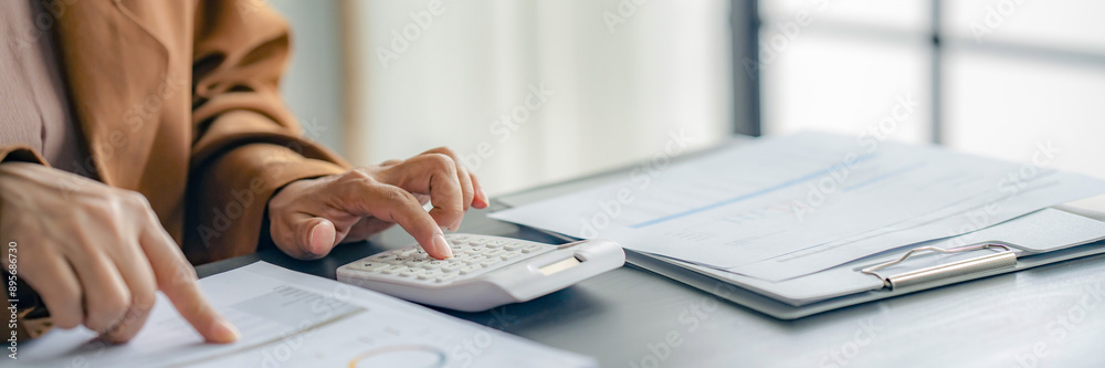 business account financier audit using calculator and analyzing data annual report