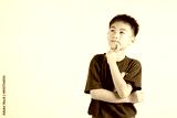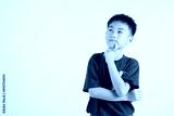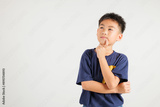 Portrait of an Asian kid boy deep in thought, standing with chin in hand, pondering a question. Studio shot isolated on white with ample copy space, primary child portraying contemplative expression