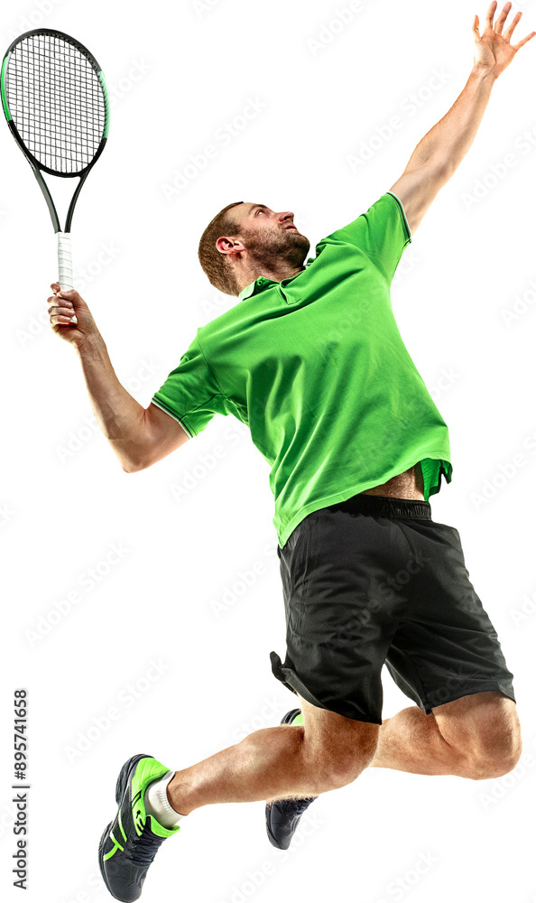 Dynamic image of focused man, tennis player hitting ball with racket in a jump, playing, training isolated on transparent background. Concept of sport, competition, tournament, game, active lifestyle