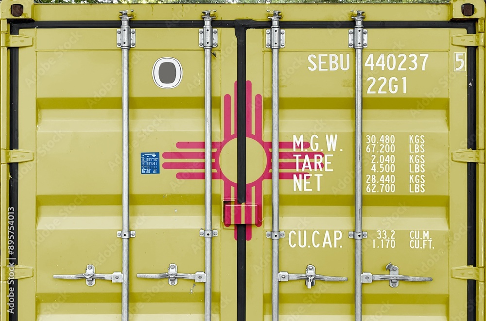 New Mexico US state flag depicted on metal doors of shipping cargo container outdoors in docks area close up
