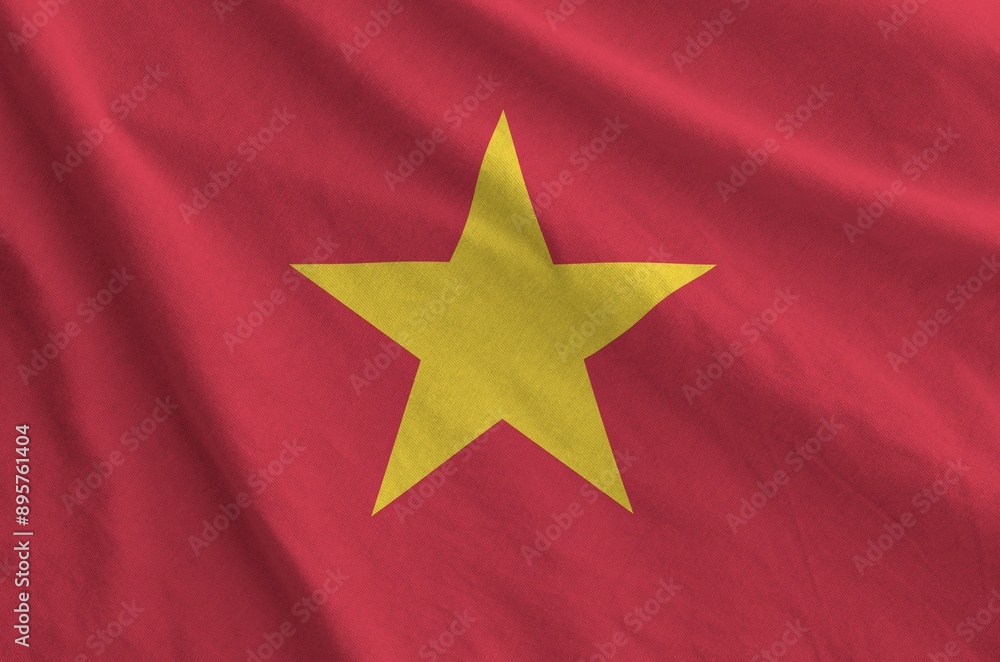 Vietnam flag depicted on folded wavy fabric of old cloth close up