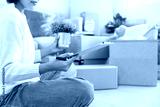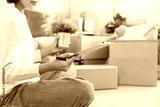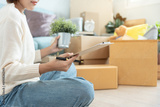 Move house, relocation. Woman using household checklist for new apartment Inside the room are cardboard boxes containing personal belongings and furniture. Move into a house or condominium