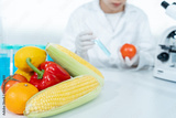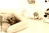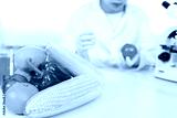 Scientist check chemical food residues in laboratory. Control experts inspect quality of fruits, vegetables. lab, hazards, ROHs, find prohibited substances, contaminate, Microscope, Microbiologist
