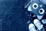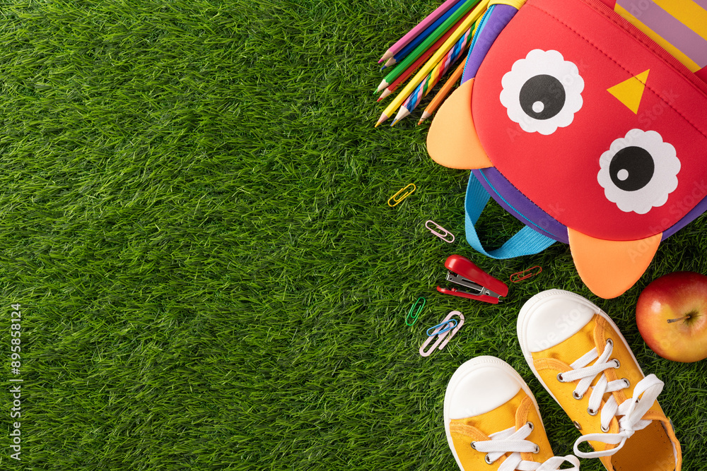 Top view of back to school essentials including a backpack, shoes, and supplies on a green grass background