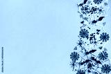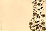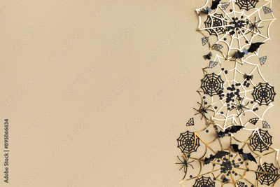 Mystery halloween holiday greeting card with seasonal party decorations from bats, spider web on golden table top view. .