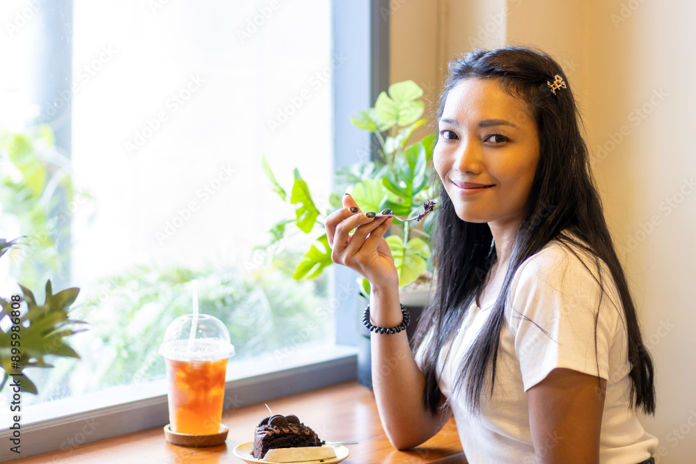 A young woman tastes a dessert in a cafe