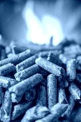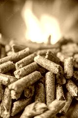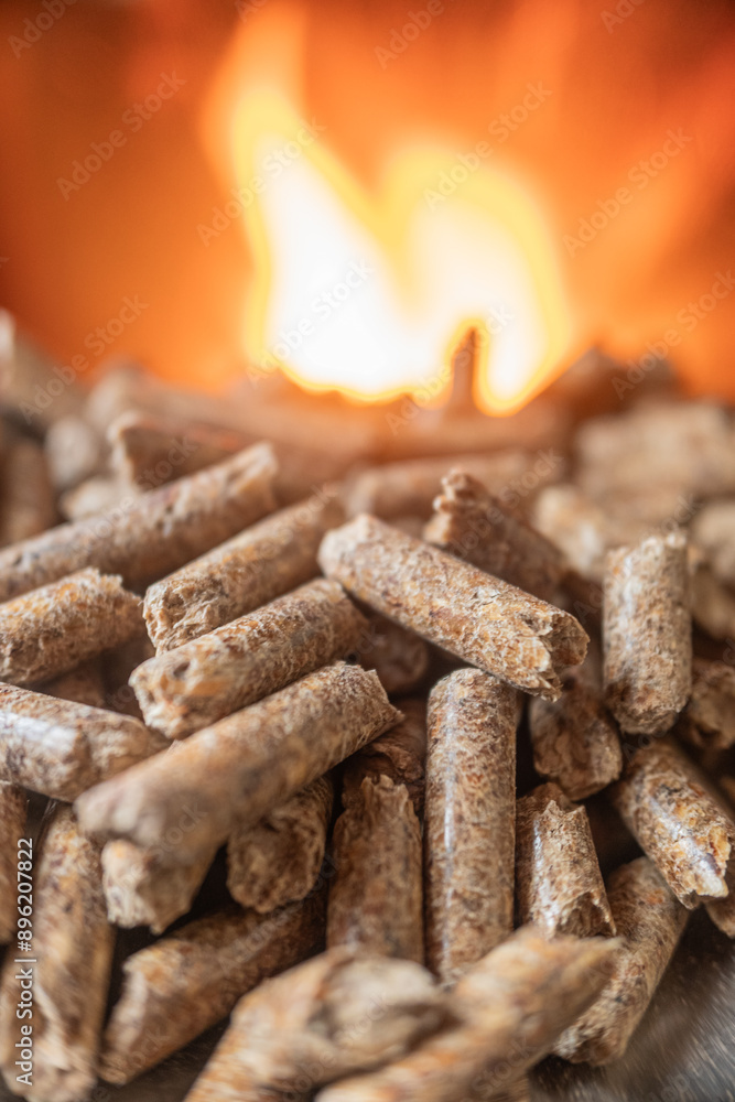 wood sawdust pellets for wood stoves, ecological biofuel with fire in background. Selective focus