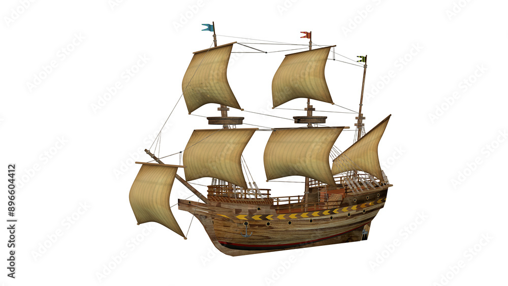 Old Wooden Ship, 3D rendered image, transparent background.
