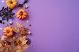 Decorative Halloween background featuring pumpkins, dried leaves, skulls, spider webs, and bat shapes on a purple backdrop
