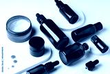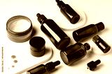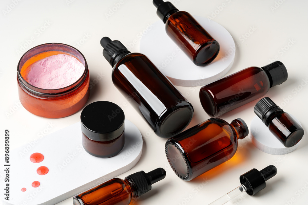 Amber Glass Bottles and Jars of Skincare Products on White Background