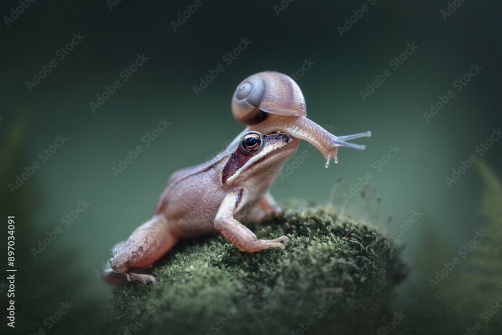 Funny animals. Fantasy beautiful magical fairy meadow with frog and snail. In a magical fairy-tale enchanted forest, a funny plot, a snail sits on the head of a frog.