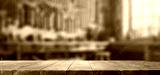 Empty wooden work table with space for tools and products. Blurred background of craft workshop and wall with tools.