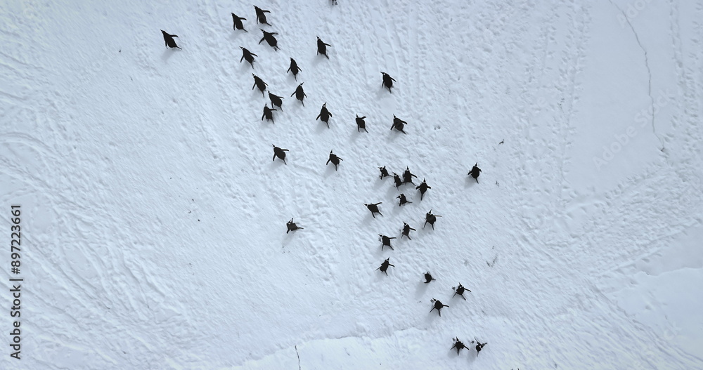 Black and white penguins run snow covered field aerial view. Explore wildlife in Antarctica. Beauty of wild animals and untouched nature on South Pole. Top drone flight above Antarctic birds migration