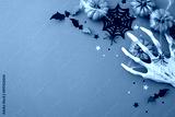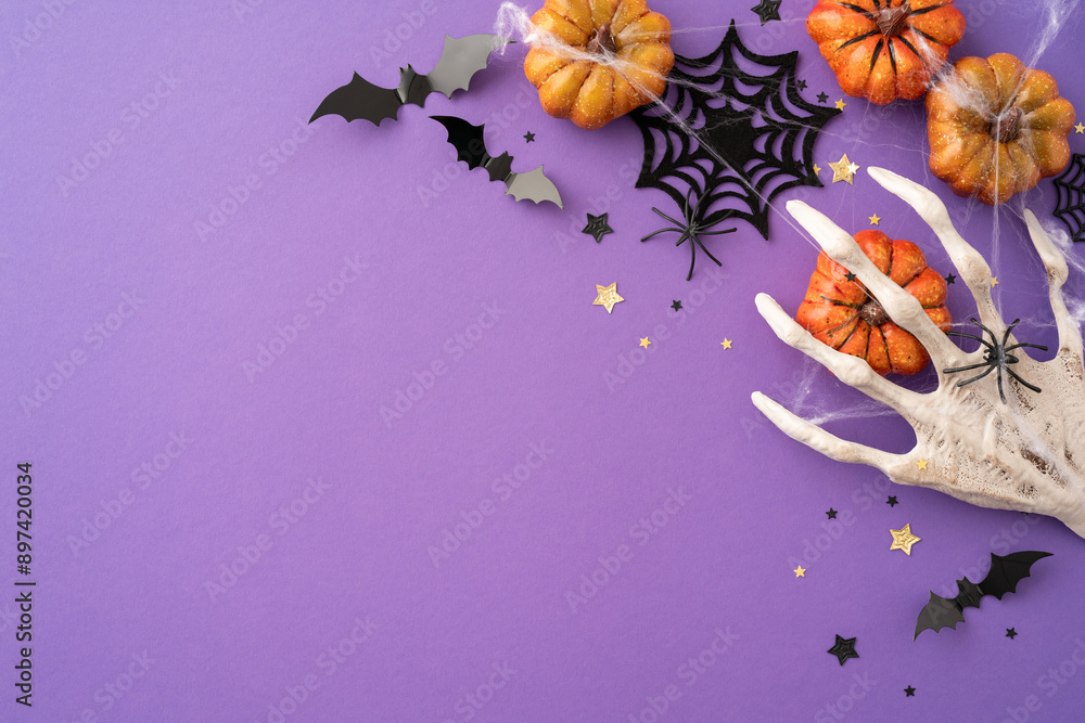 Purple background with Halloween decorations including pumpkins, bats, spider webs, and a skeleton hand creating a spooky atmosphere