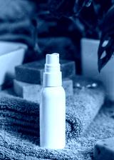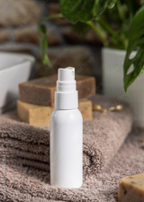 White spray bottle on brown towels near sink and green plant close up, cosmetic mockup