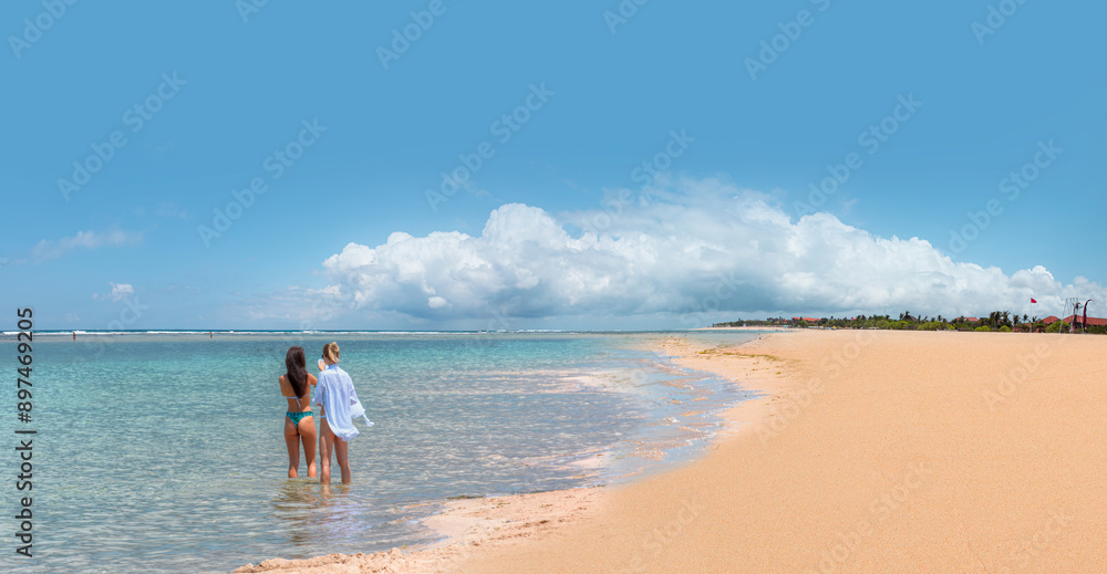 Funny girls taking selfie photo by smartphone on tropical sea beach - Bali, indonesia