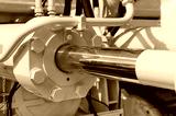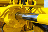 Hydraulic piston system for bulldozers, tractors, excavators, chrome plated cylinder shaft of yellow machine, construction heavy industry detail, selective focus