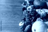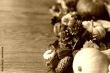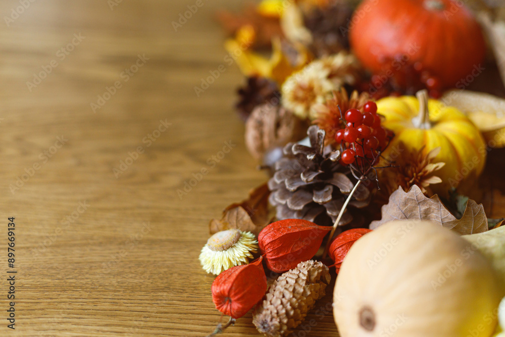 Thanksgiving background. Pumpkins, fall leaves and flowers, berries and pine cones on wooden background with space for text. Autumn banner. Fall harvest