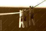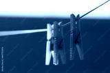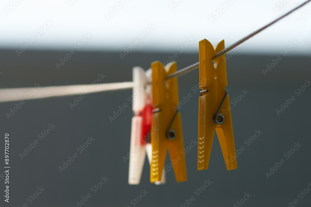 Three lone plastic clothespins on a clothesline. Macro.